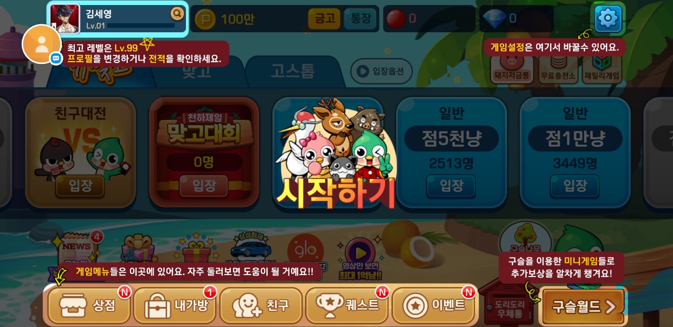 설치하기를 하시면 아래와 같이 로그인 1번하신 후 모든 게임서비스를 이용하실 수 있고 휴대폰 본인인증도 한번 하시면 피망뉴맞고 고스톱을 즐길 수 있습니다